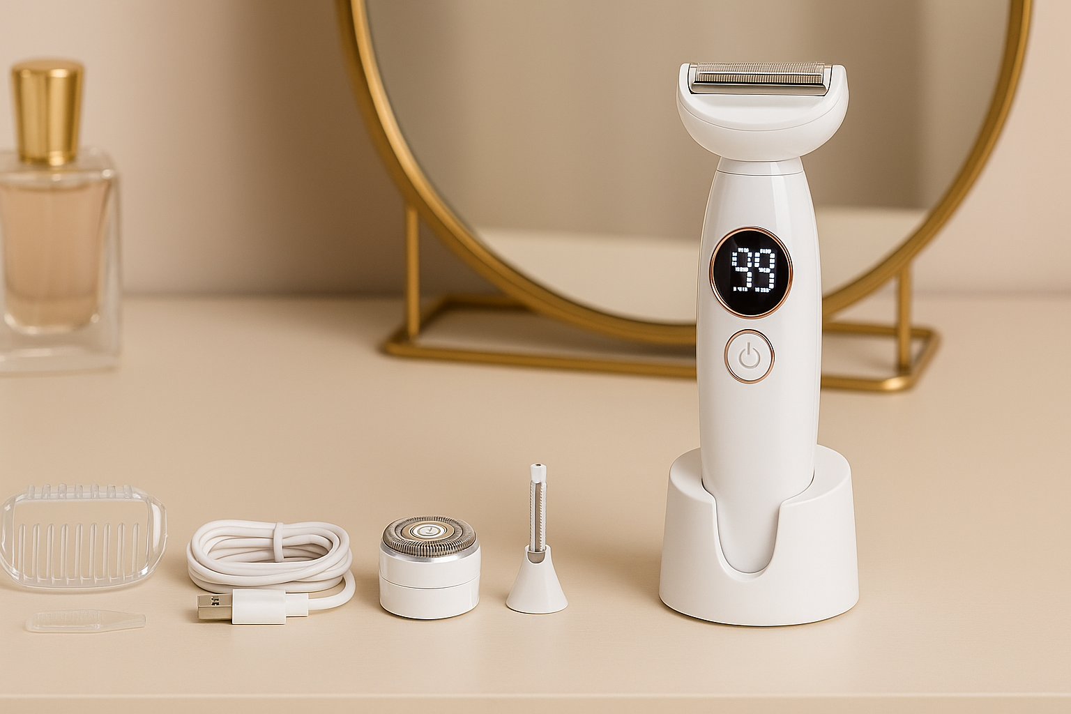 Elektrischer Damenrasierer mit LED-Anzeige in Ladestation, umgeben von Zubehör wie Kammaufsatz, Reinigungsbürste, USB-Kabel, Präzisionstrimmer und Ersatzkopf auf einem Schminktisch mit Spiegel und Parfumflakon.